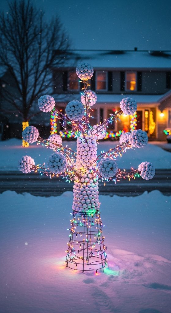 If you’ve got a yard, why not make an outdoor golf ball Christmas tree? Use a metal frame, string lights, and golf balls as ornaments.