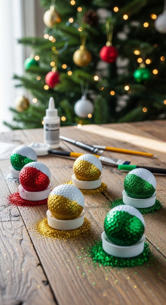 Want some sparkle? Dip golf balls in glue, roll them in glitter, and you’ve got shimmering ornaments. Choose festive shades—red, green, gold, or even icy silver.