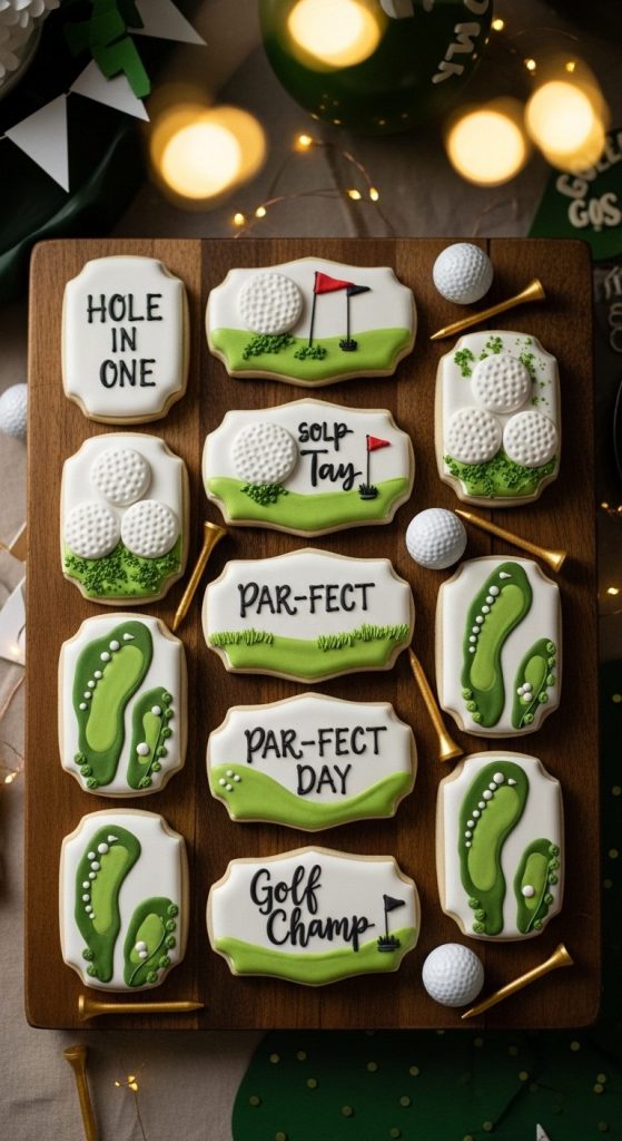 Use plaque-shaped cookie cutters and pipe golf ball + text (like “Hole in One” or “Fore!”).