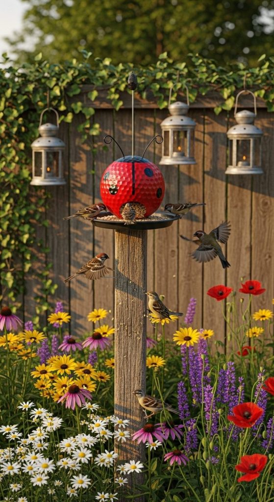 Why not lure birds too? You can hollow out or attach a seed tray to a decorative golf ball ladybug, turning it into a quirky bird feeder.