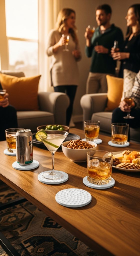 Imagine round coasters that look like golf balls. Functional, fun, and perfect for coffee tables.