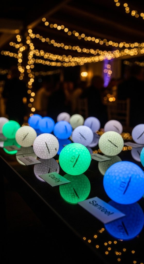 For evening receptions, use LED or glow-in-the-dark golf balls with names etched or labeled.