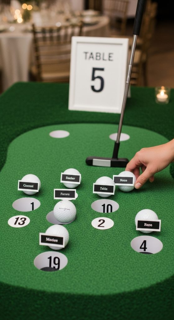 Build a mini putting green with holes marked by table numbers. Guests find their ball (with name) inside the hole matching their table.