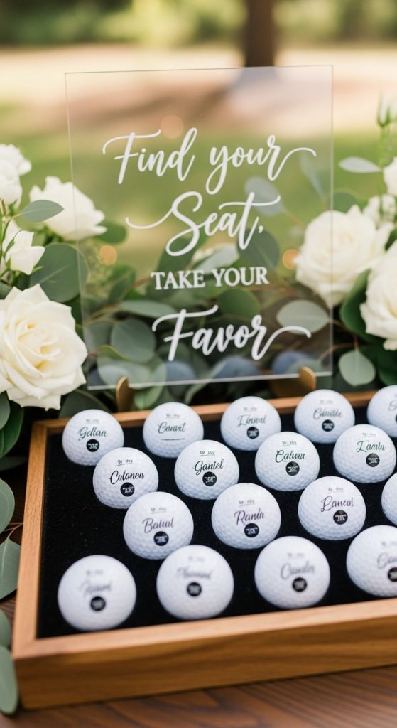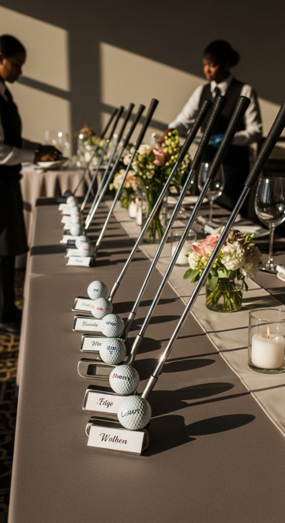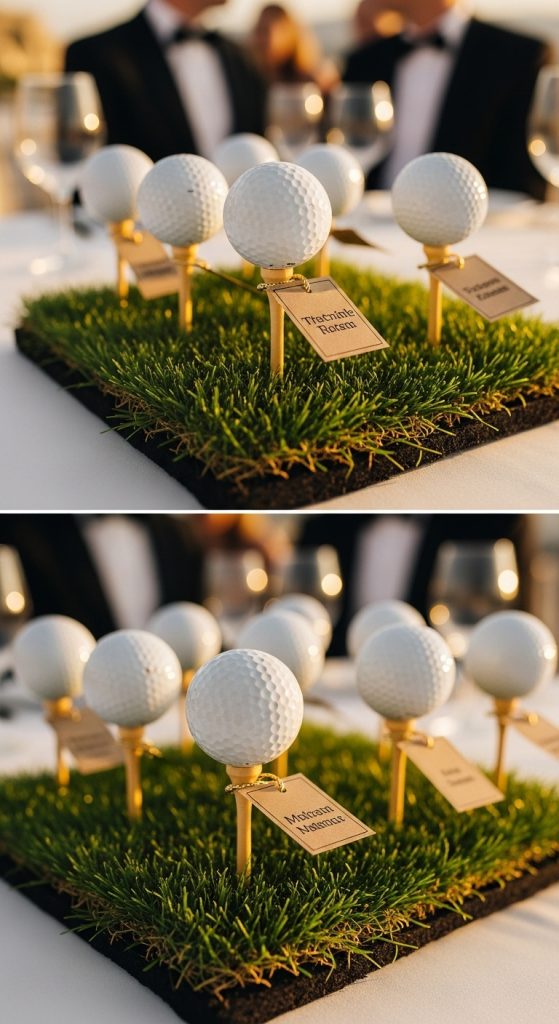 Sometimes you can’t beat the classics. Imagine a table lined with golf balls, each one sitting neatly on a little stand with a guest’s name. It’s clean, simple, and screams golf without going overboard.