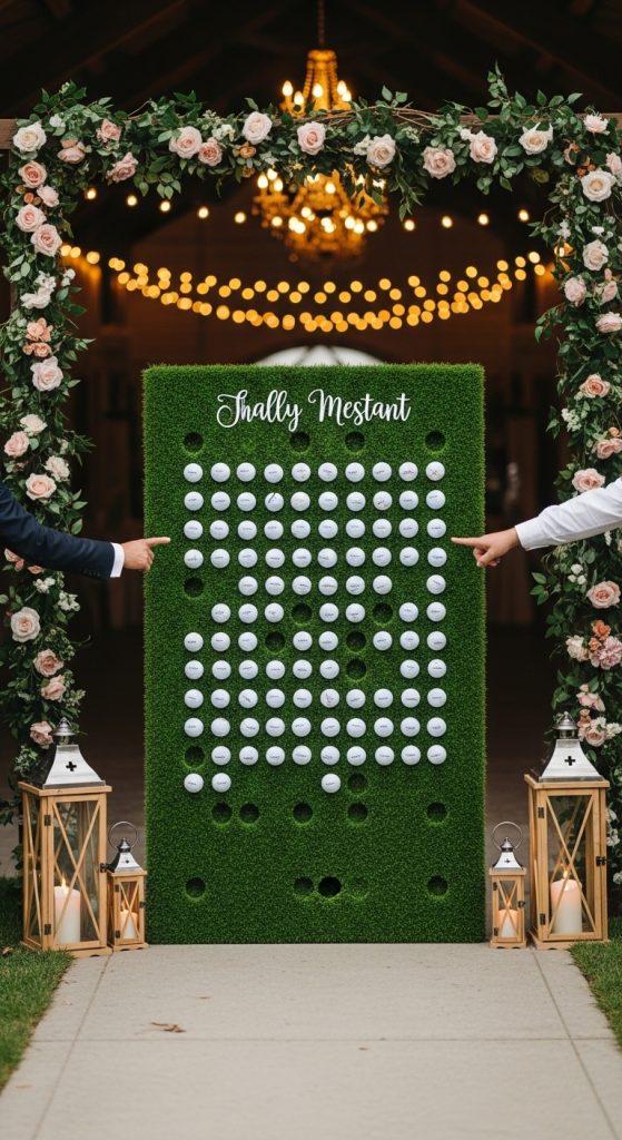 Build a wall of golf balls with initials or monograms, each ball linked to a guest. Arrange them in alphabetical order for easy searching.