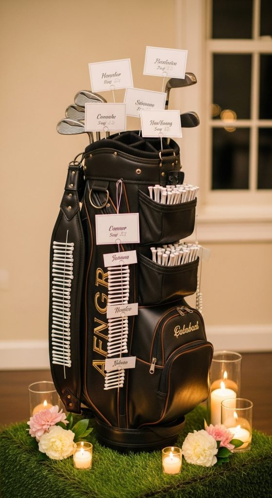 Turn a golf bag into your seating chart stand. Attach name cards to tees sticking out of the bag’s pockets and holders.