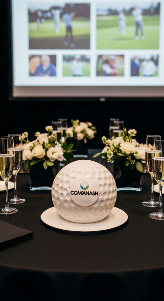 Ever wanted your cake branded? You can print custom edible logos and place them on the golf ball smash cake—perfect for tournaments or company events.