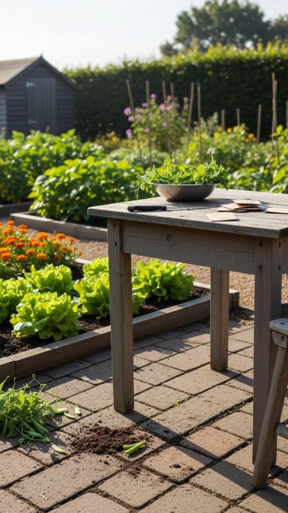 You can recreate this with a basic wooden or metal table near your vegetable beds.