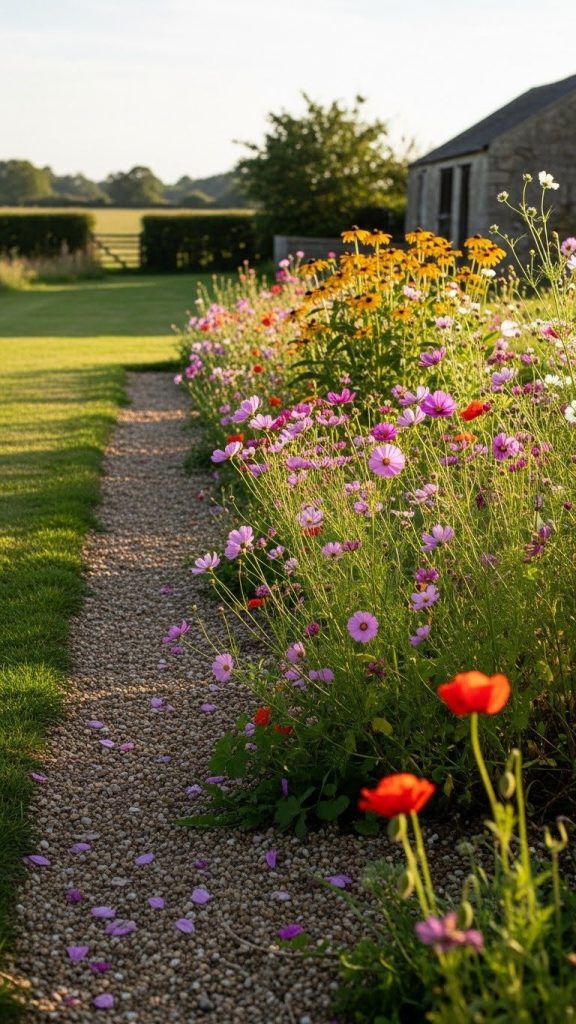 Many grandmas let a small section “go wild.” Not messy—just soft and natural. Wildflowers like cosmos, bachelor’s buttons, rudbeckia, and poppies fill space easily.