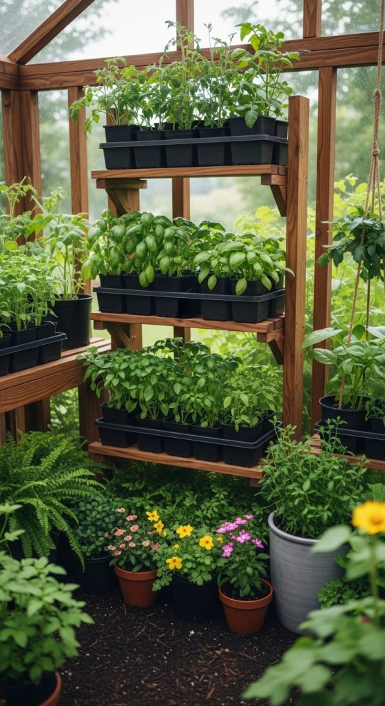 Maximizing space is everything in a greenhouse. Tiered shelving lets you grow seedlings, herbs, and flowering plants at multiple heights without overcrowding. Imagine your basil and tomatoes thriving on top shelves while leafy greens take the lower tiers.