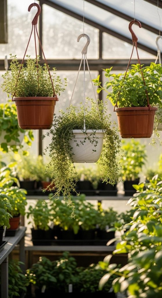 Mini takeaway: A hanging herb setup feels like your greenhouse is floating in freshness—practical, fragrant, and stylish.
