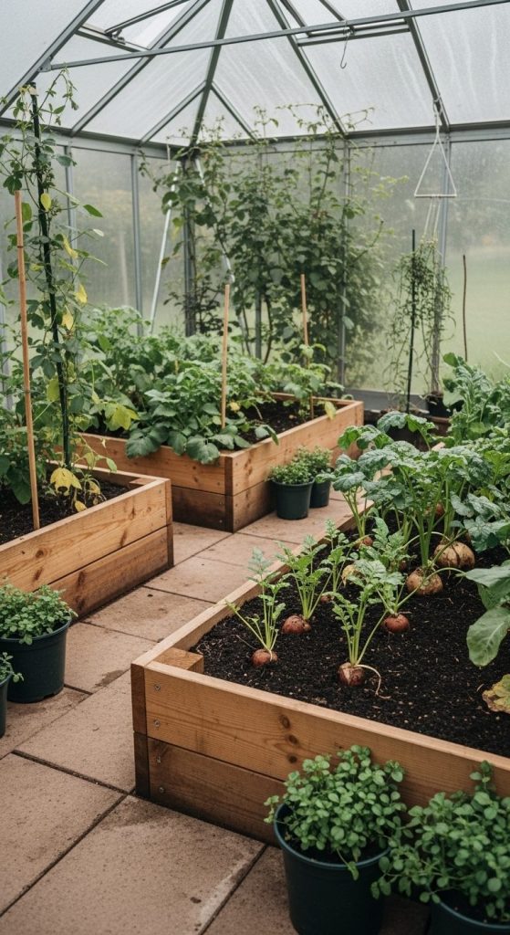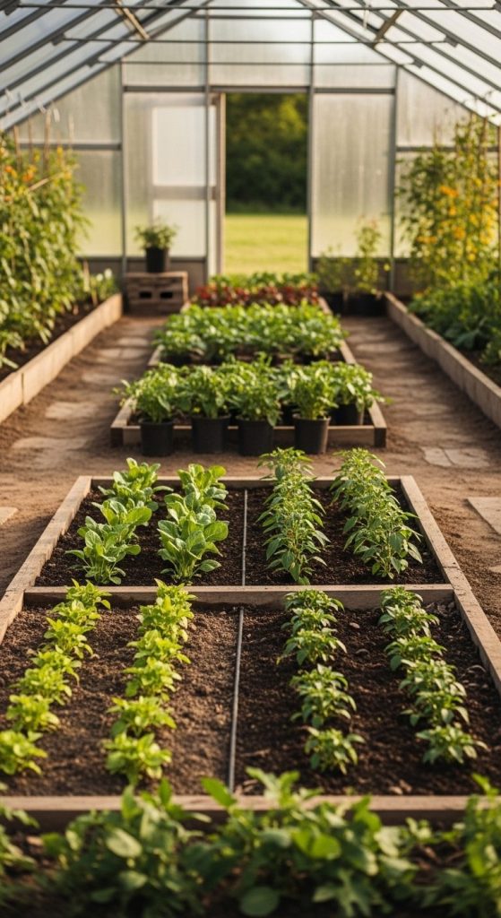 Set up beds or containers for seasonal crops. Winter leafy greens, spring tomatoes, summer peppers, and fall herbs ensure your greenhouse stays productive year-round.