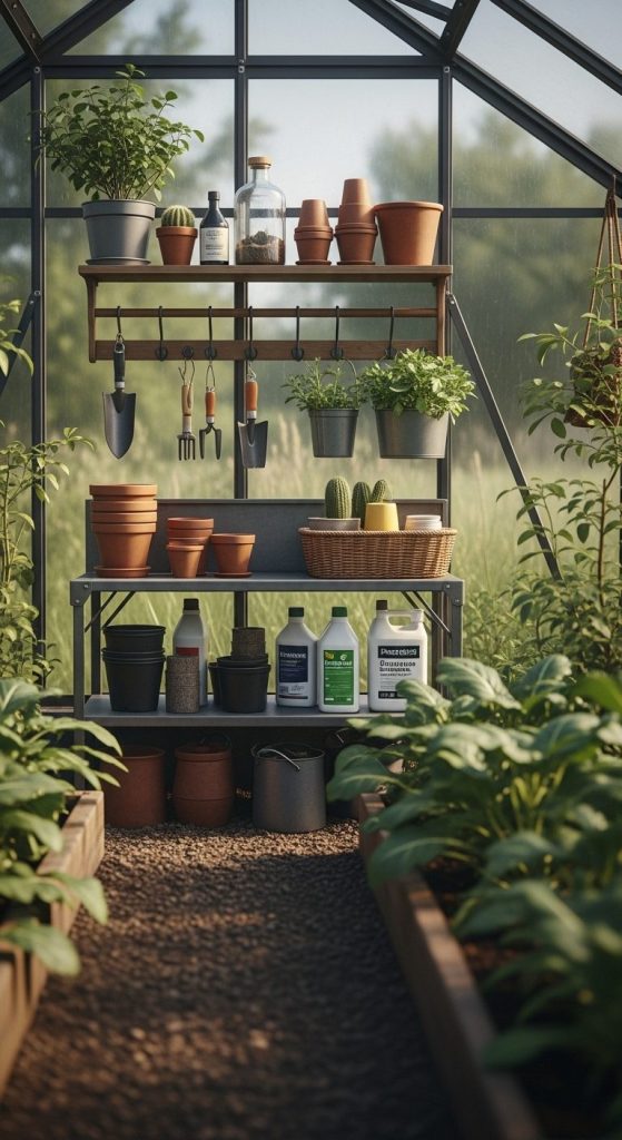 Designate small shelves or hooks for pots, tools, and fertilizers. It keeps the space tidy and ensures efficiency when planting or harvesting.