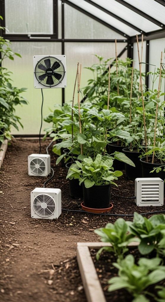 Install small fans or vents to regulate temperature and humidity. Good airflow prevents mold, strengthens stems, and supports plant health.