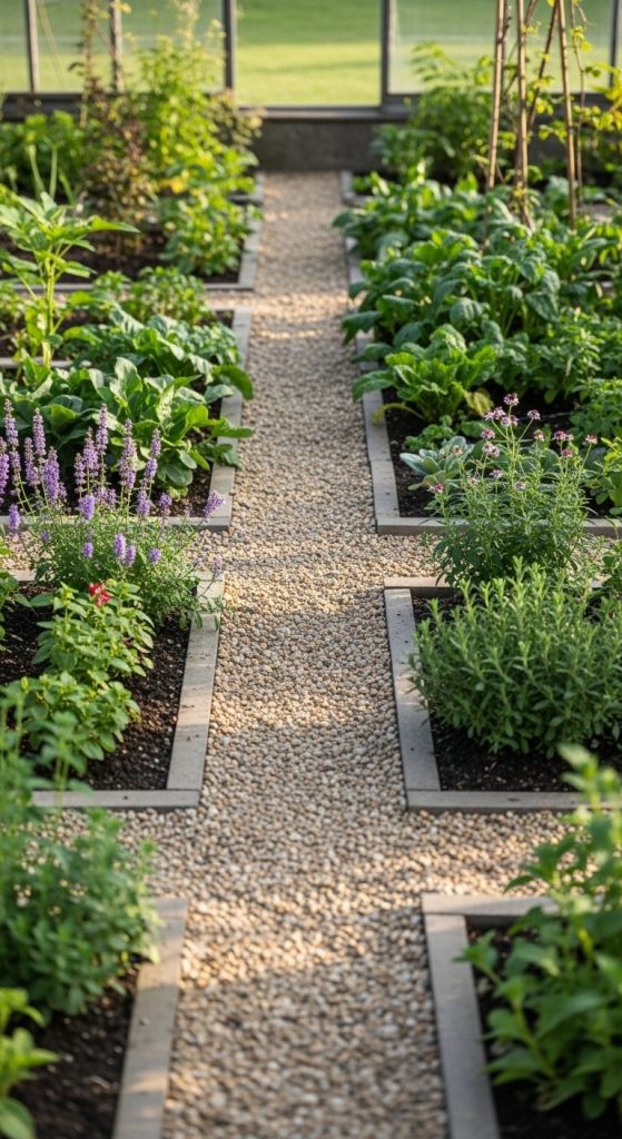 Add a narrow gravel or stone path through the greenhouse. It separates sections, keeps feet dry, and guides the eye through your organized space.