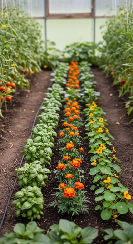 Design your greenhouse with companion planting in mind. Tomatoes grow well with basil, peppers with marigolds, and cucumbers with nasturtiums. This not only looks organized but improves plant health.