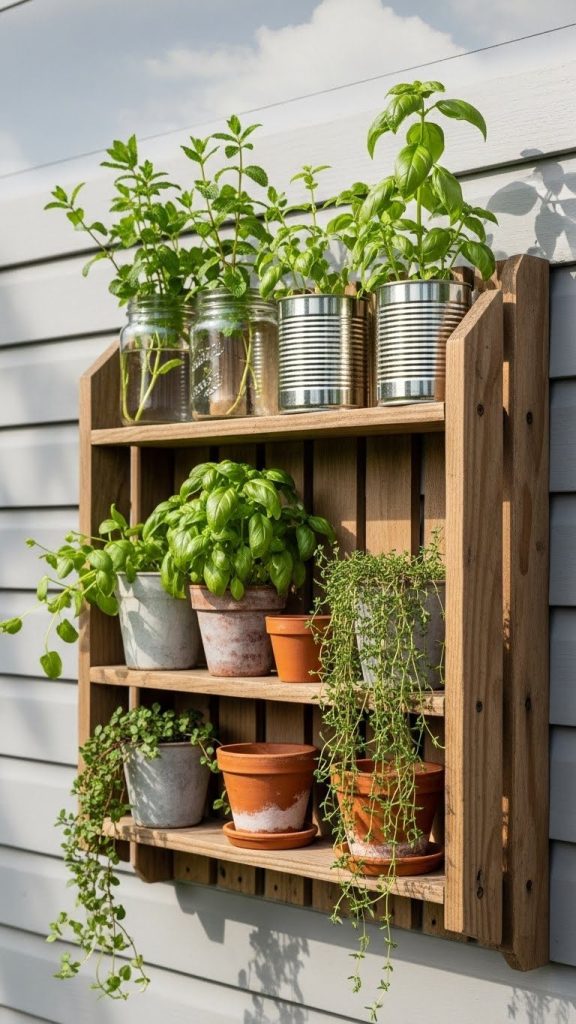 Imagine a narrow shelf made from rescued wood, stacked with jars, tiny pots, and trailing herbs. It’s practical, earthy, and incredibly charming. Plus, even the smallest outdoor space can fit one.