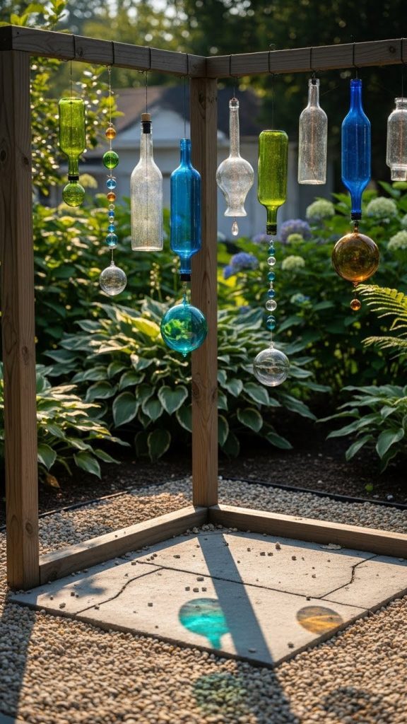 There’s something almost therapeutic about sunlight passing through colored glass. A hippie garden favorite is hanging recycled glass pieces—bottles, beads, or old chandelier drops—in one sunny spot so they cast tiny sparks of color around.