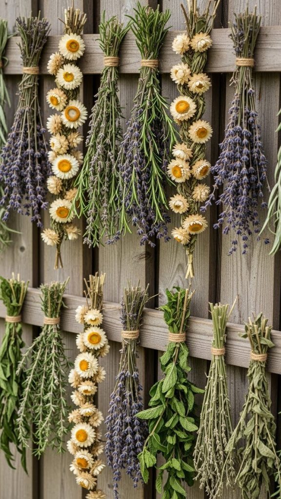 This one looks incredibly charming: braiding dried herbs and flowers and hanging them on a wooden plank like an open wall display. Mint, lavender, rosemary, and dried strawflowers work beautifully.
