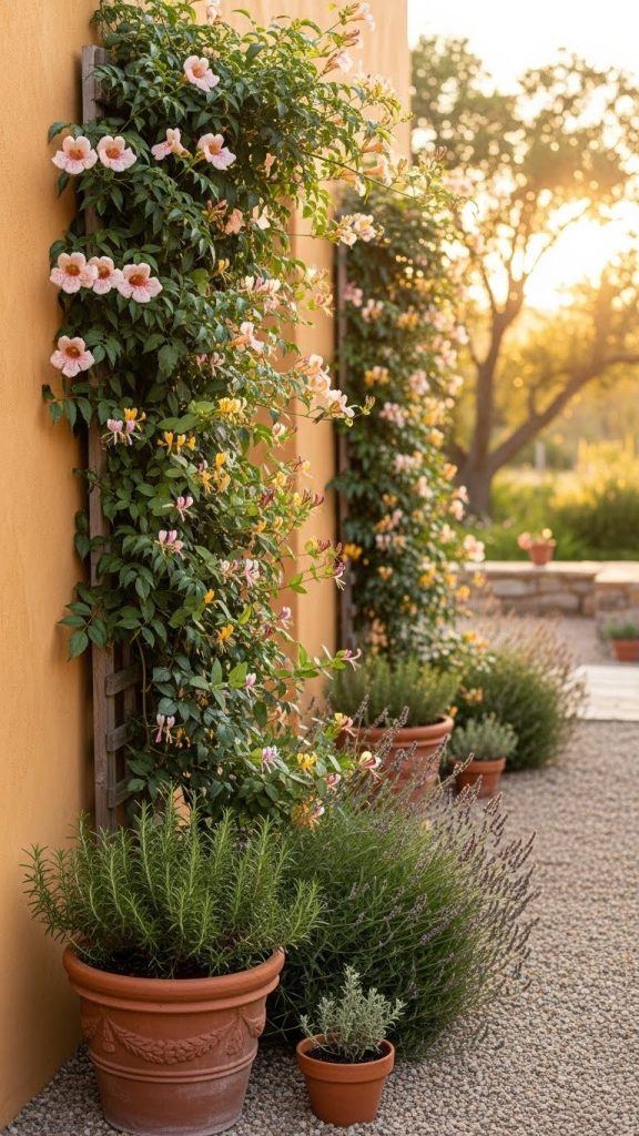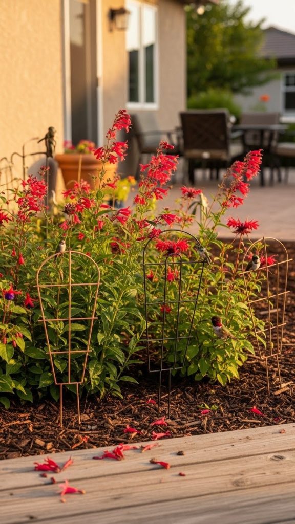 Climbing vines like honeysuckle or trumpet vine maximize space and create nectar-rich vertical layers. I added honeysuckle along a trellis, and it became an instant hummingbird hotspot.