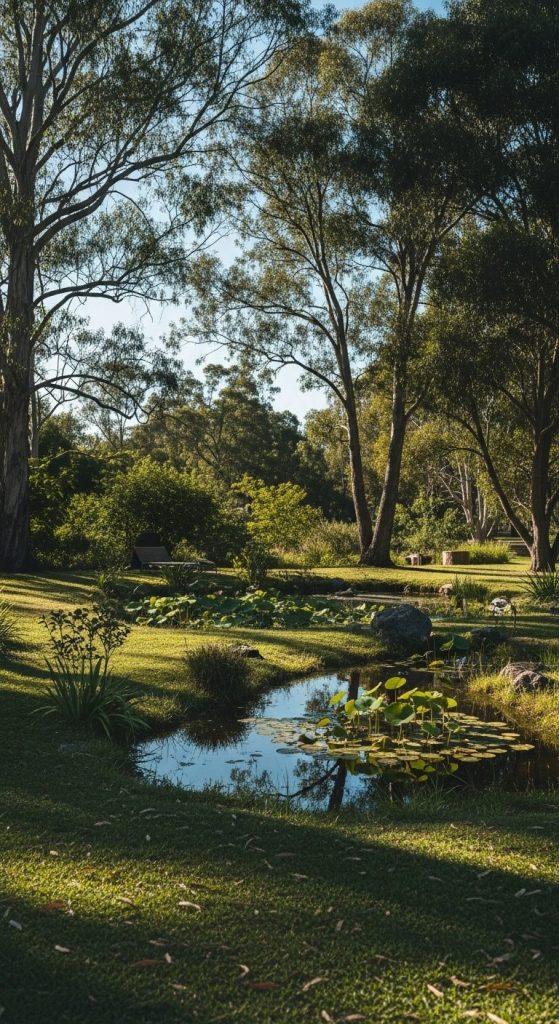 Mini takeaway: Shade trees anchor your garden and complement the pond’s serene energy.
