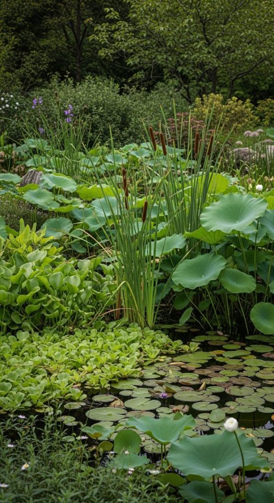 Floating ferns, water hyacinths, or marginal plants like cattails add layers of texture.