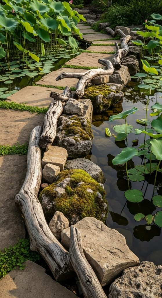 Rocks, stones, or driftwood around the pond soften its edges and create a natural look.