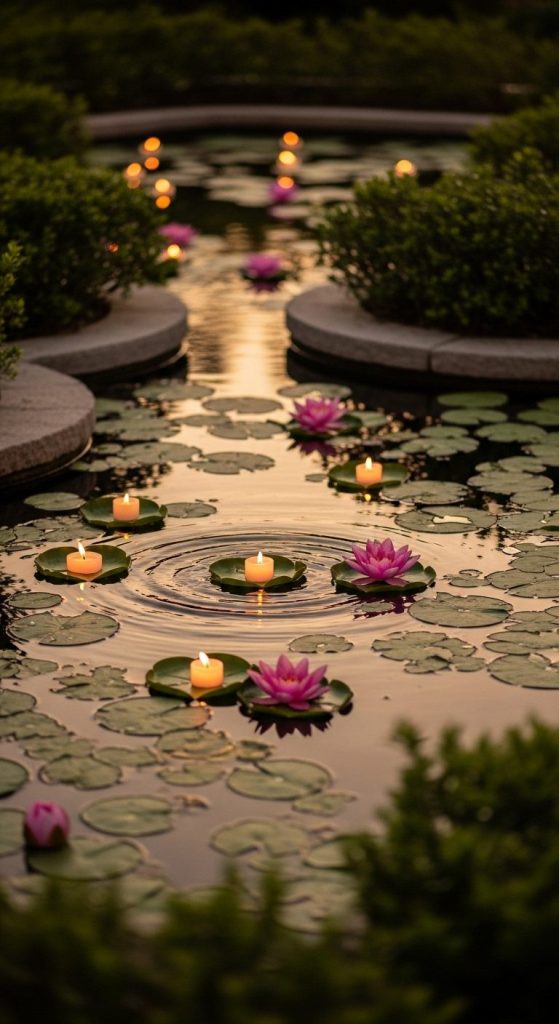 Mini takeaway: Floating lights make your pond garden enchanting long after sunset.