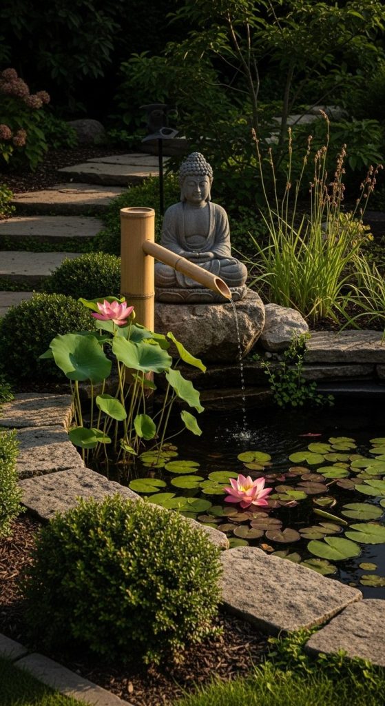 Stone statues, bamboo water spouts, or Buddha figures add personality and thematic depth.