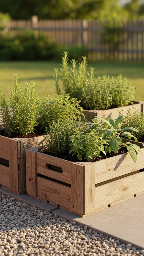 Get 2–3 wooden crates, line them with a breathable liner, add good soil, and plant herbs that enjoy staying a bit dry between waterings — rosemary, thyme, oregano, or sage. These herbs love rustic vibes too. They look natural and relaxed in a crate setting.