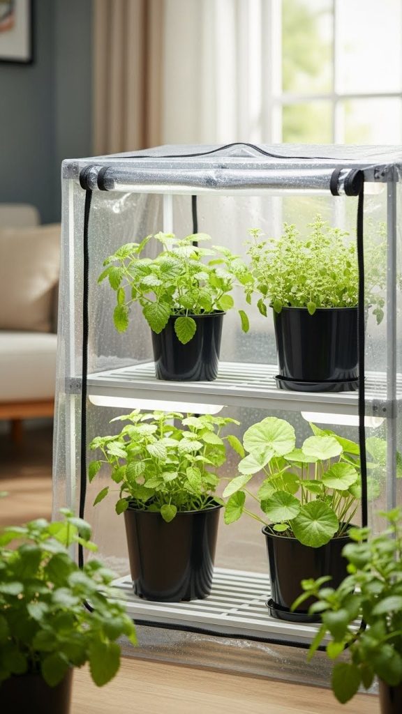 Some herbs love humidity and stable temperatures. Others grow slowly and benefit from a protected environment. A small indoor greenhouse shelf solves this beautifully. You don’t need anything huge — a simple three-tier greenhouse covered with a transparent film works perfectly.