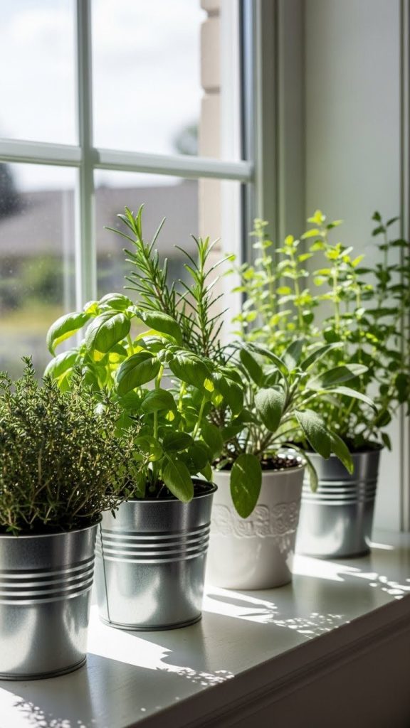 Sun-loving herbs like thyme, oregano, rosemary, basil, and sage thrive here. The key is choosing compact varieties so the space stays manageable. I once grew five herbs on a single narrow sill using tin planters. The sunlight transformed them into tiny powerhouses.
