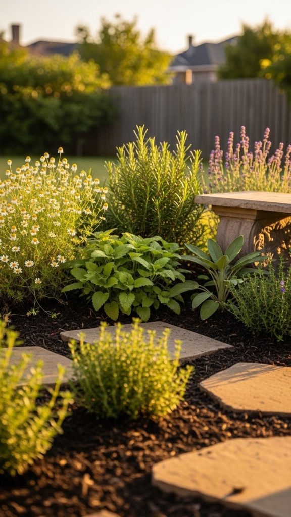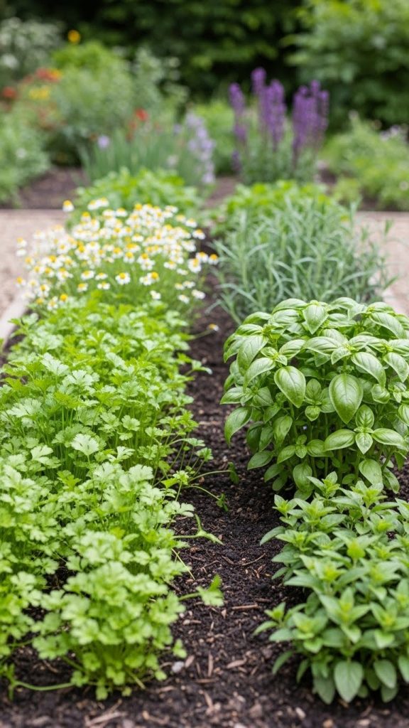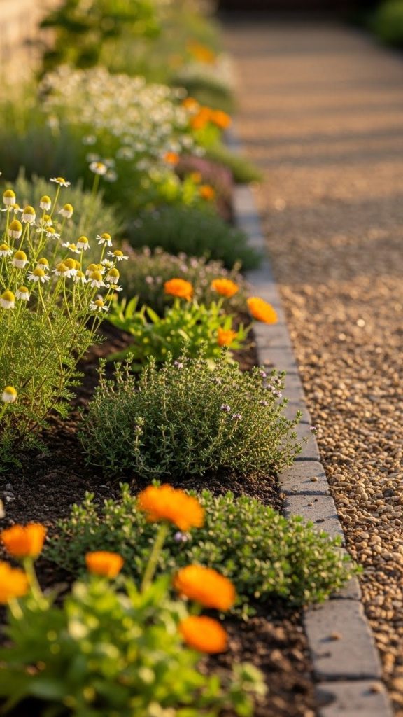 If you want something decorative and functional, a herb border along a walkway looks incredible. Short herbs like chamomile, thyme, and calendula soften the edges beautifully while giving you constant access.