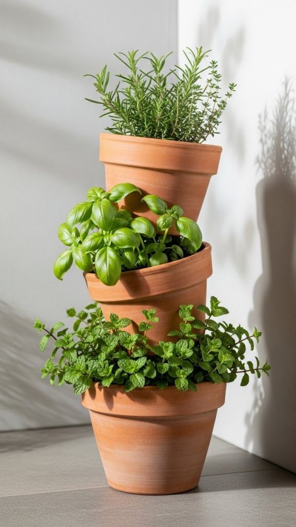 Clay pot towers are perfect when you want a lot of herbs in a tiny footprint. The stacked structure looks adorable and works beautifully for herbs with different root depths.