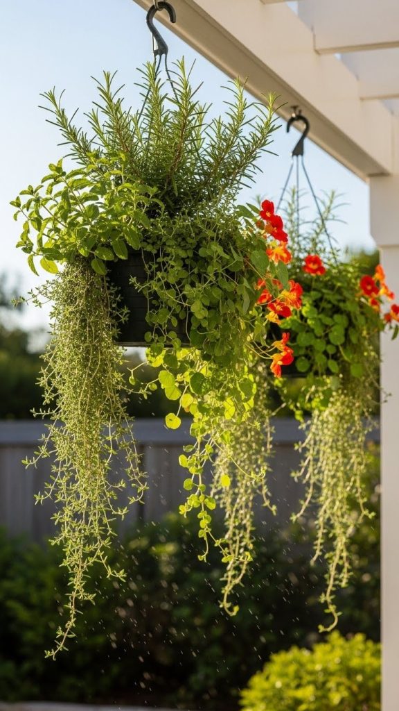 Some herbs cascade beautifully, creating softness and volume. Hanging baskets work especially well on patios, porches, and balconies. You can fill them with trailing rosemary, mint, creeping thyme, and even nasturtium for skin-soothing benefits.