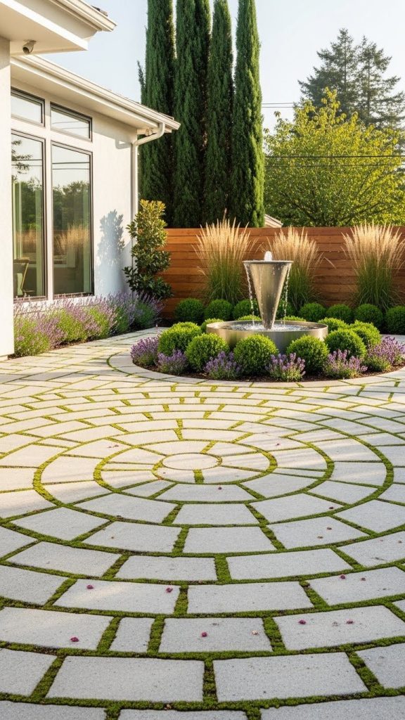 Designing paths and patios in circular patterns can make fountains, sculptures, or seating areas feel central and intentional.