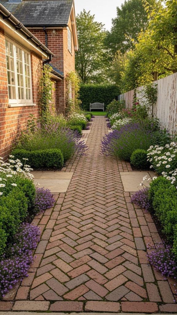 Herringbone paving adds instant sophistication and structure, making it feel like the garden was professionally curated.