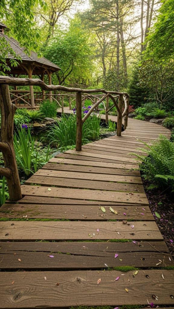 Wooden paths work well in shady gardens, near ponds, or to bridge uneven terrain, creating a natural, inviting walkway.
