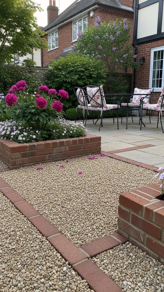 Combining two materials—like bricks with gravel or small stones—creates a stylish border and defines garden areas effectively.