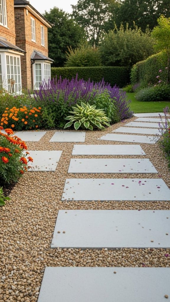 Slate slabs interspersed with low groundcovers or wildflowers create a natural, serene path. It’s an excellent choice for informal gardens.