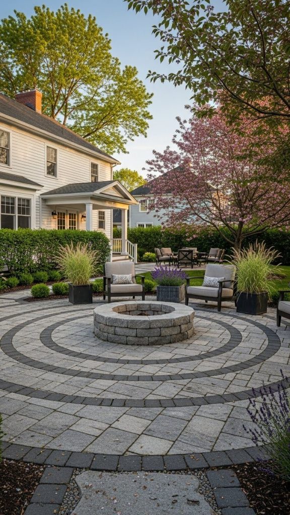 A circular paved area around a fire pit is perfect for cozy evening gatherings. The shape fosters conversation while clearly defining the social space.