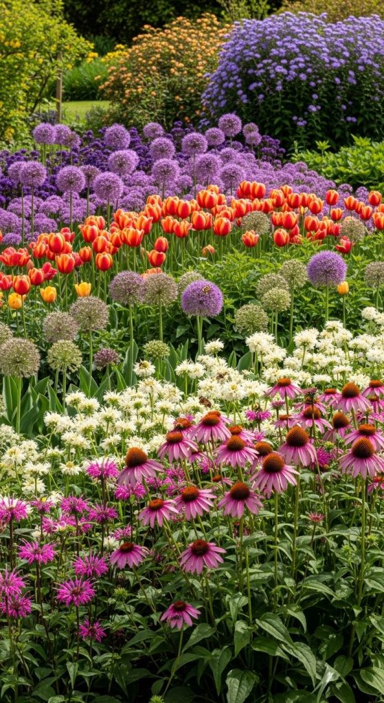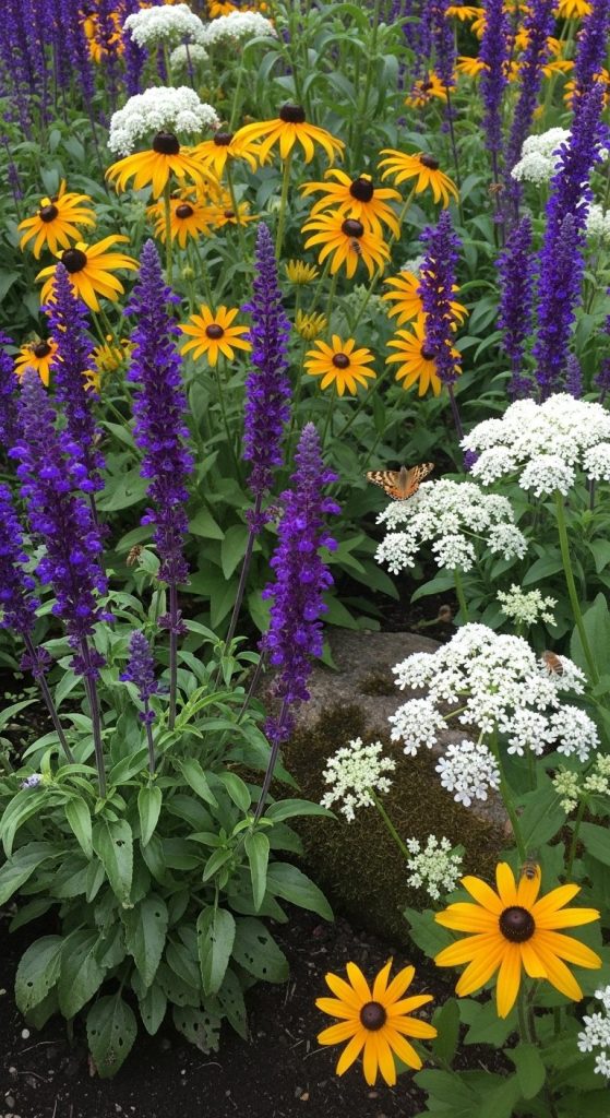 - Adds rhythm and movement visually; pollinators follow these blooms.