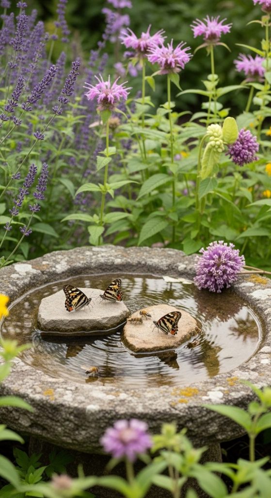 If we want pollinators to hang around, water helps—especially in dry seasons. Including a shallow water feature, damp patch or wet-rock edge gives them what they need. I added a small bird-bath with flat stones and observed bees using the stones as landing pads.