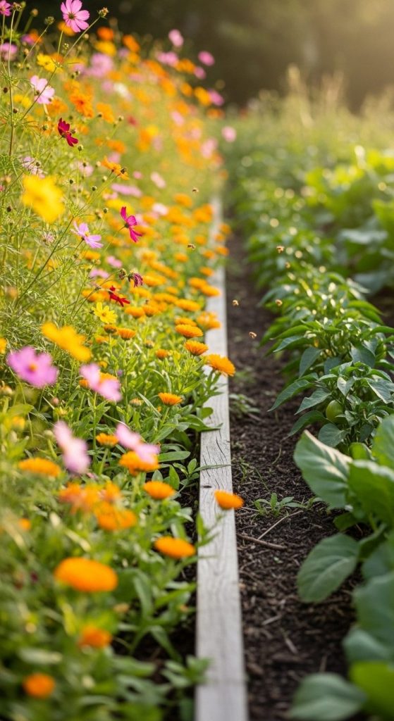 Your pollinator garden layout doesn’t have to be isolated. Integrating transition zones—edges where your pollinator bed meets lawn, vegetable garden, or patio—creates seamless flow and supports more species. I designed mine so that the veggie bed backs onto the pollinator bed. Bugs moved easily between both.
