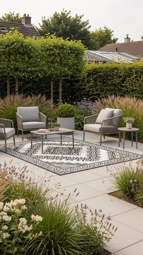 Outdoor rugs don’t get enough credit. They anchor a seating area, add texture, and help soften hard surfaces around the pool.