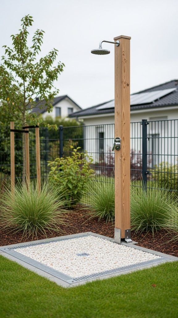 Outdoor showers aren’t just for fancy beach houses. A simple wooden post, a shower head, and a drainage bed make rinsing off super easy before or after swimming.