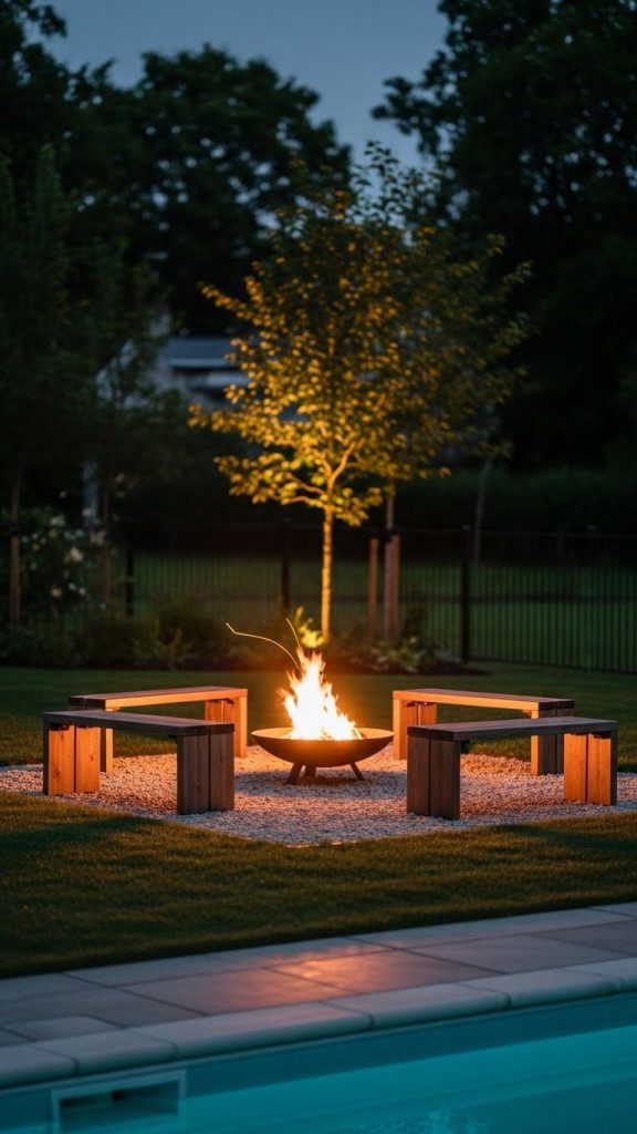 Fire and water together feel amazing. A small fire pit or portable fire bowl near the pool adds warmth at night and encourages people to hang around long after swimming.