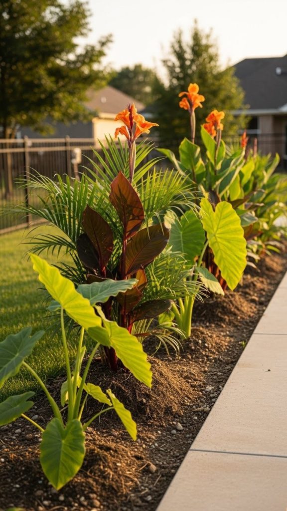 Think canna lilies, bamboo, hardy palms, or elephant ears depending on your region.