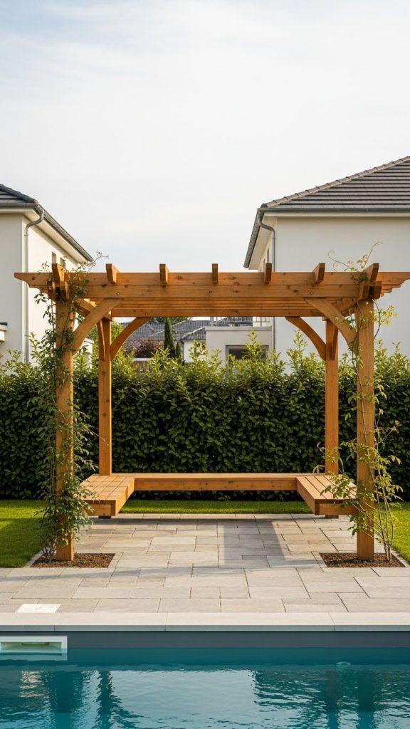 A simple pergola brings architectural interest without closing off the space. I like how it offers shade but still keeps things airy. It’s great for people who enjoy sitting outside but not directly under harsh sun.