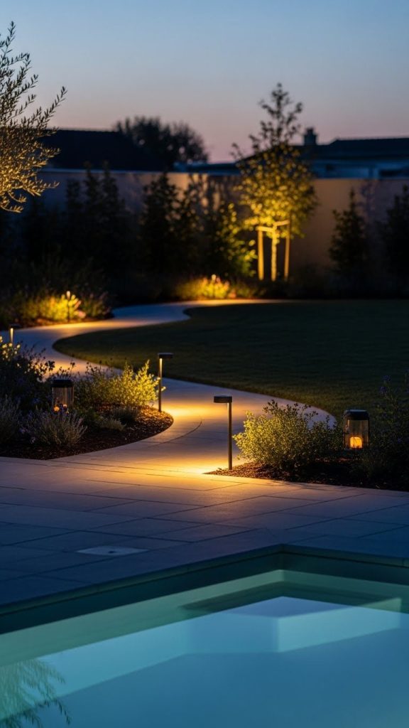Even the simplest pool area feels magical with warm lights at night. Soft path lighting, small lanterns, or solar stake lights can change everything.